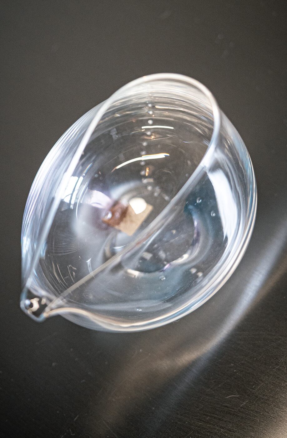 Rozmiary:  wysokość 8cm, średnica  w najszerszym punkcie 12cm Materiał: Szkło 中村マキMaki nakamura – uczeń Pana Masahiko Ichino Naczynia są tworzone metodą dmuchania szkła w powietrzu. Wzory z pęcherzyków powietrza oraz formy które są z nich tworzone są możliwe wyłącznie dzięki tej technice. Szkło topione w niewielkim piecu zawiera drobne pęcherzyki, a ślady narzędzi użytych do formowania pozostają widoczne jako znaki procesu — stając się częścią ich charakteru i uroku.